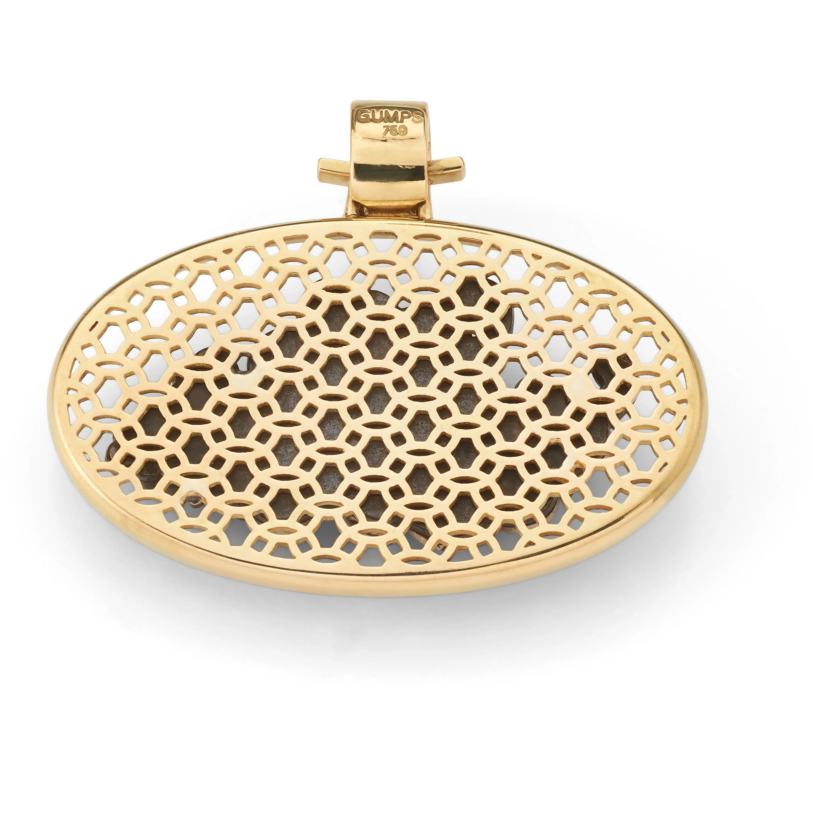A small obi-dome of pure silver in the form of a chrysanthemum, the symbol of purity and all that is dignified, noble and beautiful is set in a custom yellow gold mounting by designer Gudrun Langner for Gump's. 18-karat yellow gold. Pure silver. 1 1/2"L x 2"W. Chain sold separately.